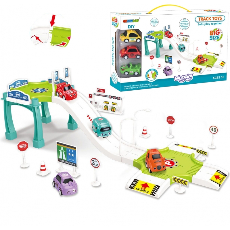 Tor Samochodowy od marki WOOPIE zachwyci każdego malucha. Maluch może jeździć 3 autami po stromej drodze i zaparkować na poziomie samochodzik lub zatankować auto na stacji benzynowej. Dodatkowo w zestawie znajduje się wiele znaków drogowych, które urozmaicą zabawę. Akcesoria i wygląda tory są...