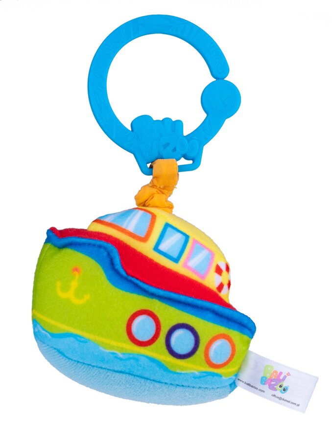Bajecznie kolorowy, pluszowy stateczek zapewni maluchowi wspaniałą rozrywkę i umili czas spaceru. Wystarczy, że bobas pociągnie go w dół, a statek podciągnie się na tasiemce do góry, wydając przy tym zabawny, wibrujący dźwięk. Praktyczna klamra pozwoli zaczepić zabawkę w dowolnym miejscu, aby mogła wszędzie towarzyszyć dzidziusiowi.