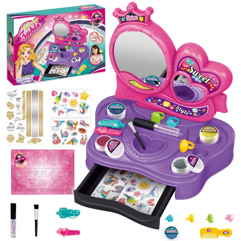 Toaletka 2w1 Studio Makijażu od marki WOOPIE wprowadzi dzieci w świat mody i pozwoli wykreować swój własny styl! Zestaw wygląda jak w prawdziwym salonie urody. Zestaw zawiera: toaletkę, 4 brokaty sypkie, po 2 zestawy naklejek i tatuaży, lakier, pędzel, szczotkę, 2 spinki oraz 4 pierścionki....