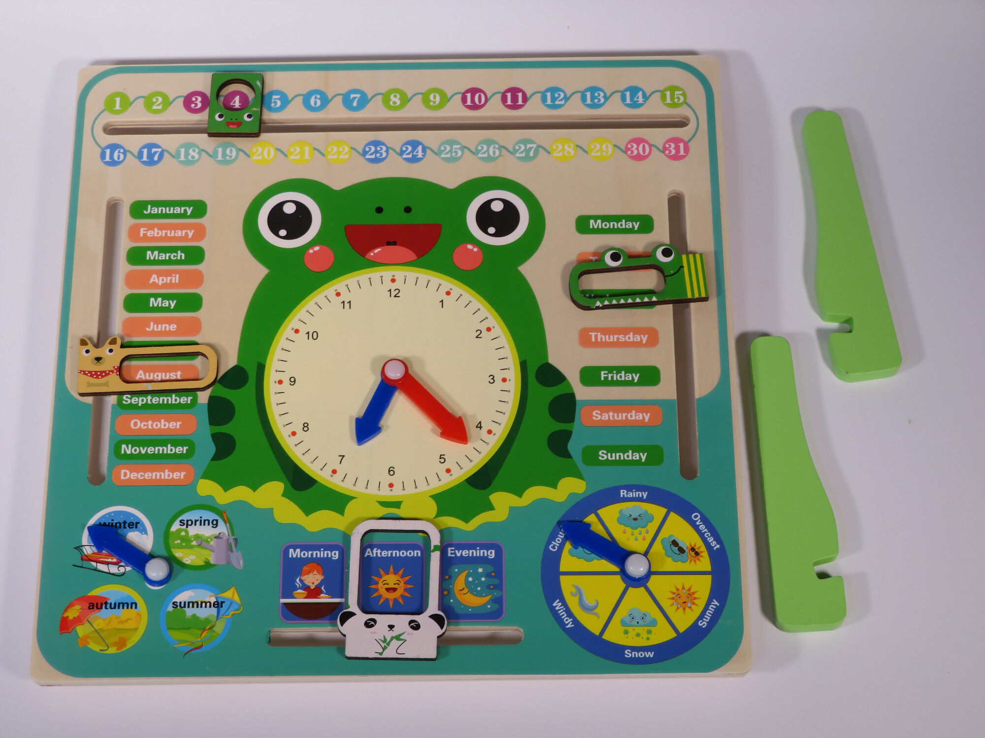 Interaktivní vzdělávací dřevěný kalendář s veselým motivem žáby přináší dětem spoustu zábavy. Hravou formou se seznámí s jednotlivými ročními obdobími, druhy počasí, fázemi dne, dny v týdnu, měsíci v roce, čísly. Prostřednictvím kalendáře se s Vaší asistencí naučí, kolik je hodin i jak si označit...