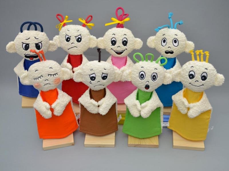 Textilní maňásek představující emoci zlost, vhodný pro psychologické poradny, speciální pedagogy, učitele ve školkách a dětských skupinách a také pro domácí hraní. Vyrobeno z přírodních materiálů. Obličej je vyšitý, hlavičky měkce cpané a celý maňásek je velmi příjemný na omak. Pratelný. Velikost...