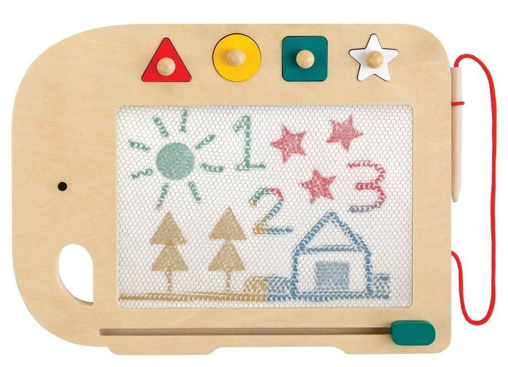 Táto dizajnová drevená tabuľka ponúka veľkú kresliacu plochu, na ktorej je možné maľovať alebo písať pribalenou ceruzkou na šnúrke. Pre zvýšenie kreativity obsahuje aj štyri farebné magnetické pečiatky (trojuholník, kruh, štvorec, hviezda), ktoré je možné ľubovoľne presúvať a vytvárať tak rôzne vzory a tvary. Vďaka magnetizmu pečiatky vždy zostanú na svojom mieste, a tabuľka tak umožňuje jednoduché priťahovanie a kombinovanie tvarov.