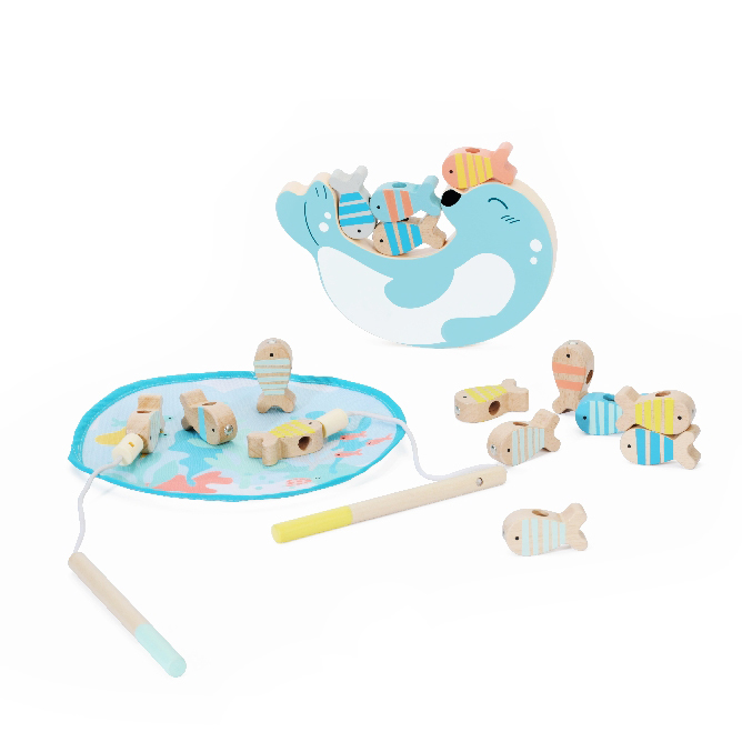 Tuto rybářskou hru lze hrát více způsoby! Můžete chytat ryby pomocí přiložených magnetických rybářských prutů a poté je pokládat na multifunkční stohovací desku. Ryby můžete stohovat na kůly nebo otočit plošinu na stranu, čímž získáte velrybu a balanční hru. Deska s kůly obsahuje také čísla, aby...