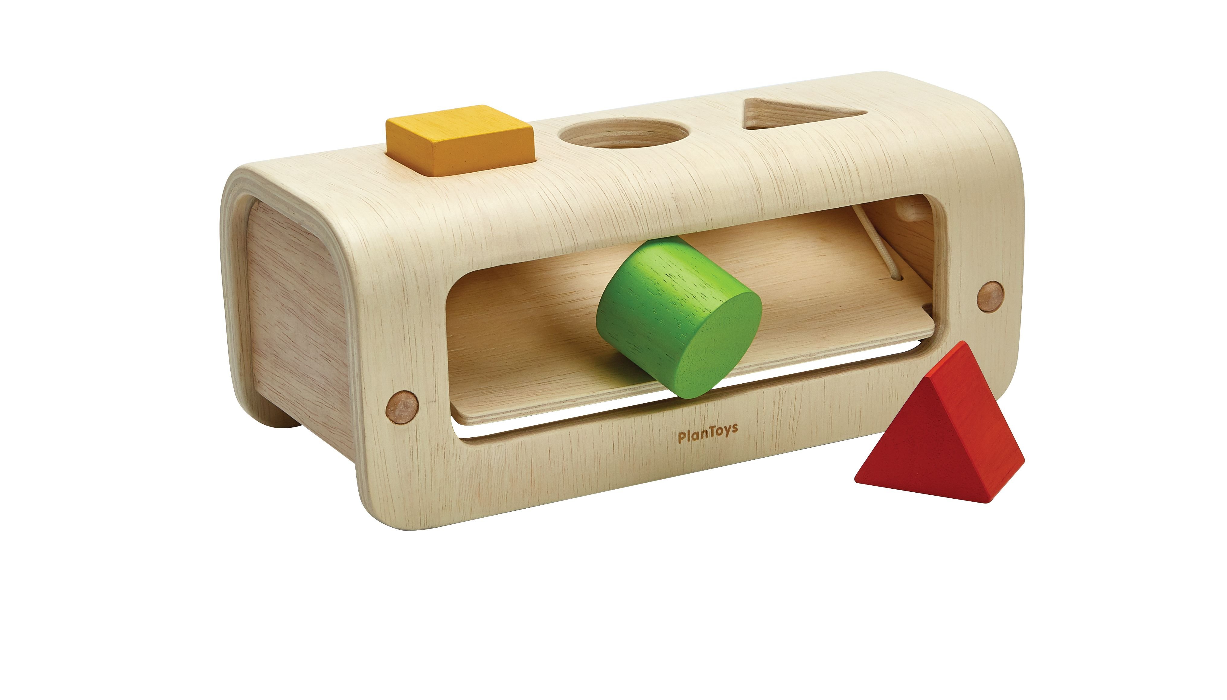 Dřevěná vkládačka od firmy Plan Toys disponuje třemi otvory na tři základní tvary - čtverec, trojúhelník a kruh.