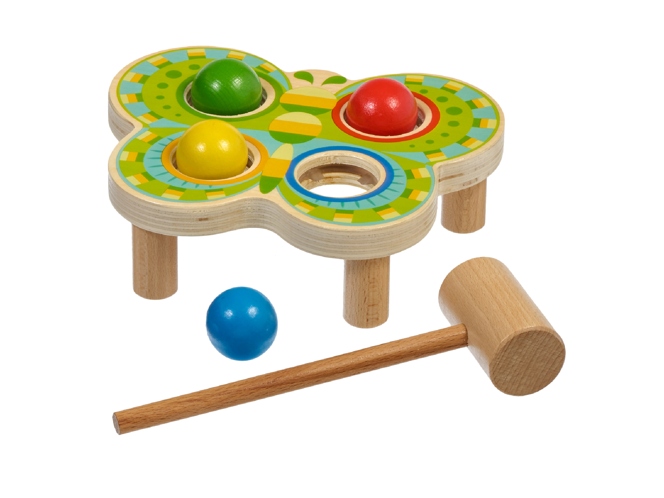 Motýl je designově netradiční dřevěná zatloukačka ve tvaru krásného barevného motýla se 4 barevnými koulemi, která zdobí jeho křídla. Je to zábavná hra, při níž děti kladívkem udeří do barevných koulí a ty následně propadnou do otvorů odpovídající barvy. Hračka slouží k rozvoji jemné motoriky, koncentrace a koordinaci pohybu. Šířka křídel motýla 21 cm, délka 20 cm, výška 5 cm. Rozměry kladívka 19 x 6 cm, průměr koule 3,5 cm.