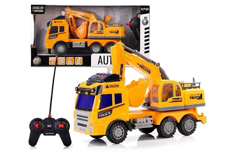 Funkcje: pełen zakres jazdy, zasięg do do 10 m, działające przednie światła, syrena z migającym światłem i dźwiękiem, 4 przyciski dźwiękowe: włączania silnika, cofania, klaksonu, pracy koparki.
