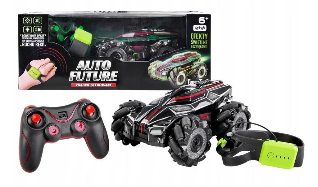 Miks wzorów, towar wysyłany losowo. Cena za sztukę. Dwa kolory: czerwony, zielony.W zestawie: auto o długości 18 cm, pilot, opaska na rękę do sterowania, akumulator, przewód do ładowania akumulatora, przewód do ładowania opaski, śrubokręt, pojemnik na wodę, funkcje: sterowanie pilotem lub opaską...