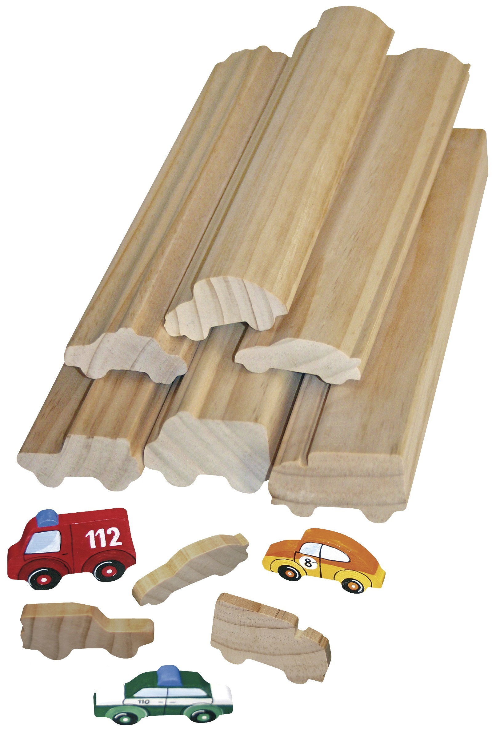 Sada obsahuje: 6 dřevěných motivů vozidel/profilů (každý o délce 30 cm).