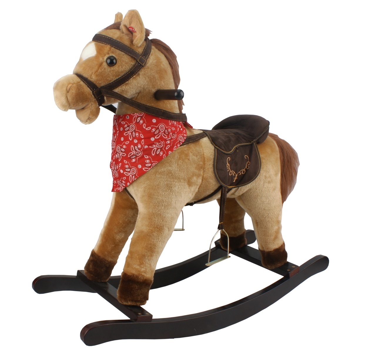 Hnědý houpací kůň s šátkem, zvukem a hýbající pusou