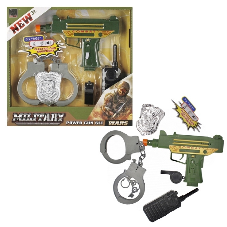 Rozvíjí kreativitu dítěte. Pistole při stisku spouště vydává zvuk střelby. Každé dítě se nyní může cítit jako skutečný voják jedoucí do války. Balení obsahuje 1x pistoli, pouta, odznak, píšťalka, vysílačka. Rozměry balení jsou 26x26x4cm. Vyžaduje napájení 3x bateriemi AG13 - součástí sady....