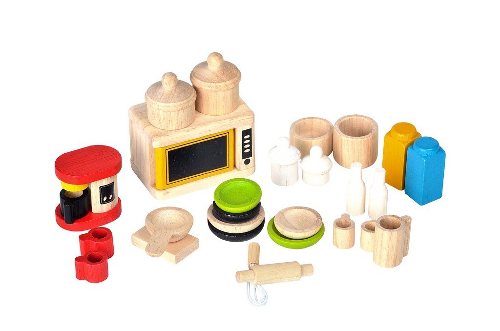 Sada z dílny společnosti Plan Toys zahrnuje výběr různých kuchyňských potřeb pro dovybavení kuchyně v domku pro panenky.