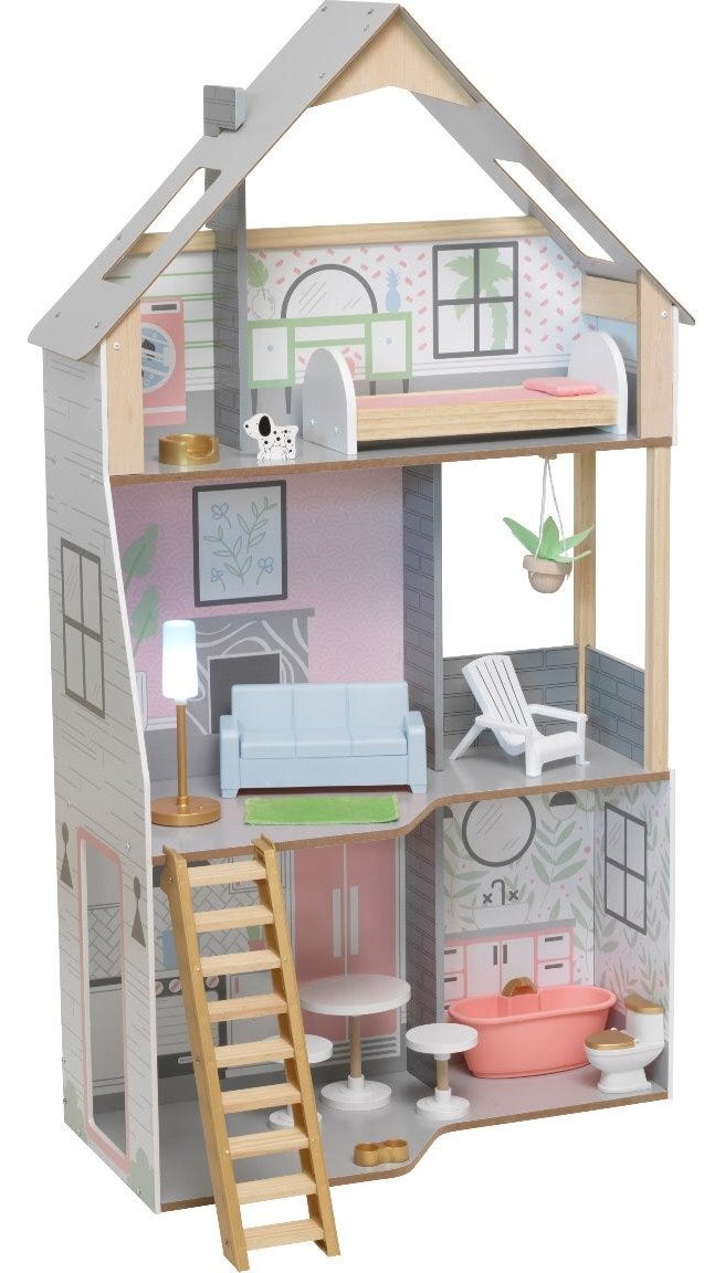 Dřevěný domeček pro panenky Alina je vzdušný a světlý. Je vhodný i do menších prostorů. Ve třech podlažích je vše, co je ke hře s panenkou potřeba. V přízemí se nachází prostorná kuchyně a kouplena, ve druhém je obyvák a veranda a v podkroví ložnice a druhá koupelna.