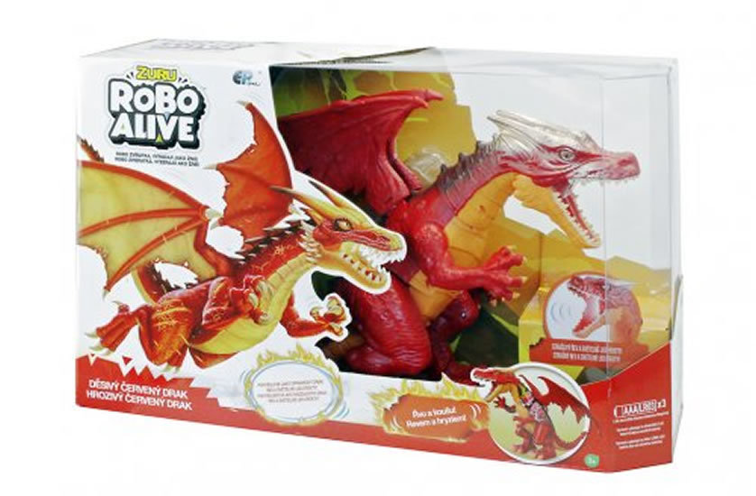 Modrý a červený drak vypadá jako ze strašidelné pohádky. Chodí, hrozivě otvírá tlamu a vydává zvuky. V tlamě mu svítí červené světlo, které připomíná oheň. Jeho oči se třpytí jako oči živého zvířete. Vypadá opravdu realisticky. Je krásně zbarvený se spoustou detailů a kvalitním zpracováním. Baterie: 3xAAA/LR03 nejsou součástí balení. Pro děti od 3 let.