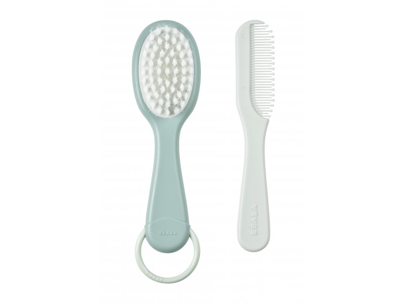 Sada pro péči o vlásky vašeho dítěte od narození obsahuje kartáč s měkkými štětinami a hřebínek se zaoblenými zuby. Ergonomický tvar kartáče i hřebene usnadňuje rodiči uchopení.