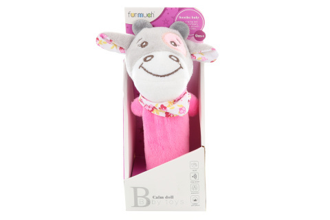 Chrastítko plyšové pískací růžové barvy s hlavou kravičky o rozměru cca 16 x 10 x 6,5 cm. Rozměr balení cca 7,5 x 17 x 6,5 cm. Věk 0+ prečítať celé
