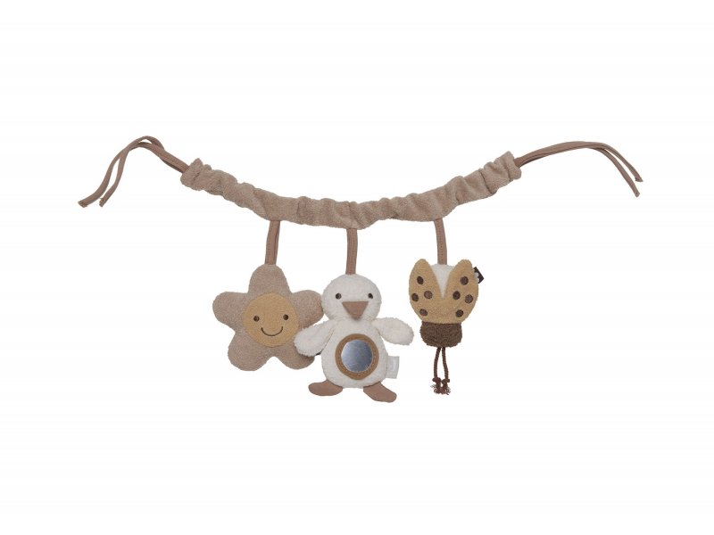 Řetěz na kočárek či autosedačku zabaví vaše dítě na procházkách i cestách autem. Tři zavěšené hračky v podobě plyšové kytičky, ptáčka a berušky při zmáčknutí šustí, beruška jemně cinká, pozornost dítěte upoutá i bezpečné zrcátko na bříšku ptáčka.