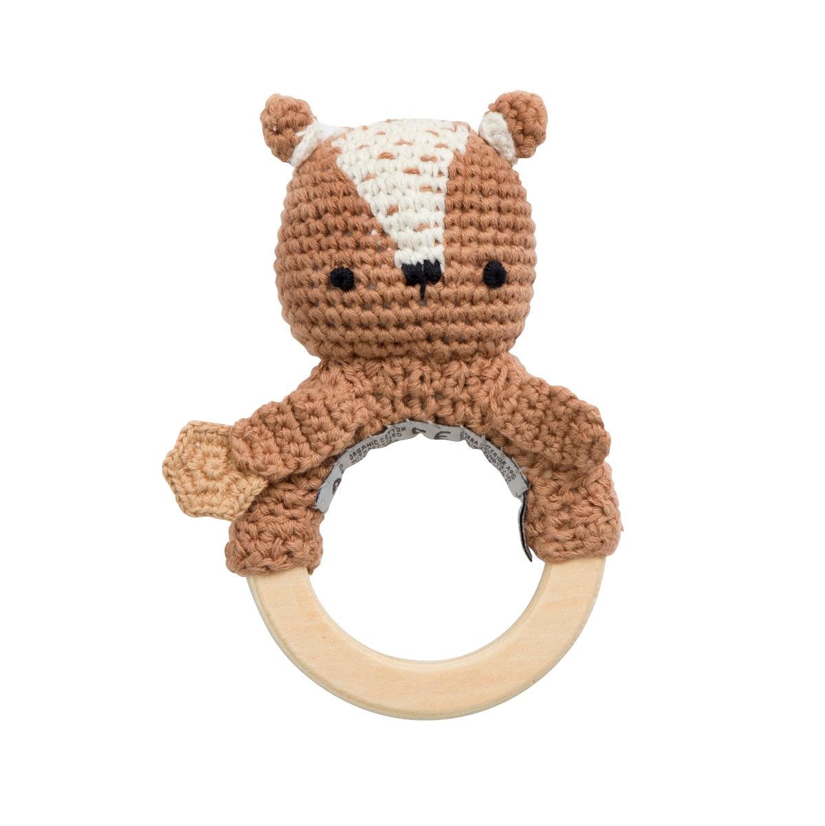 Háčkované chrastítko – Milo The BearRučně háčkované chrastítko s medvídkem Milem na dřevěném kroužku. Milo je součástí kolekce Woodland společnosti Sebra Interior. Vzhledem k tomu, že tento výrobek byl ručně háčkován, je každý výrobek jedinečný a mohou se vyskytnout odchylky v jejich vzhledu....