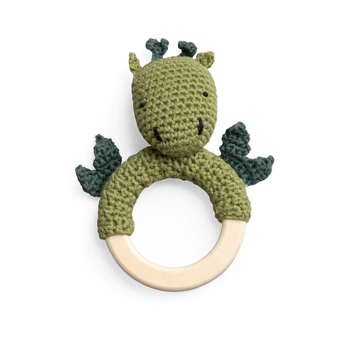Háčkované chrastítko na dřevěném kroužku – DragonRučně háčkované dračí chrastítko na dřevěném kroužku, vyrobené z organické bavlny s výplní z recyklovaného polyesteru. Dráček patří ke kolekci Sebra Dragon Tales – příběhy o rytířích a dracích.Toto chrastítko ve tvaru draka je ručně háčkované z...