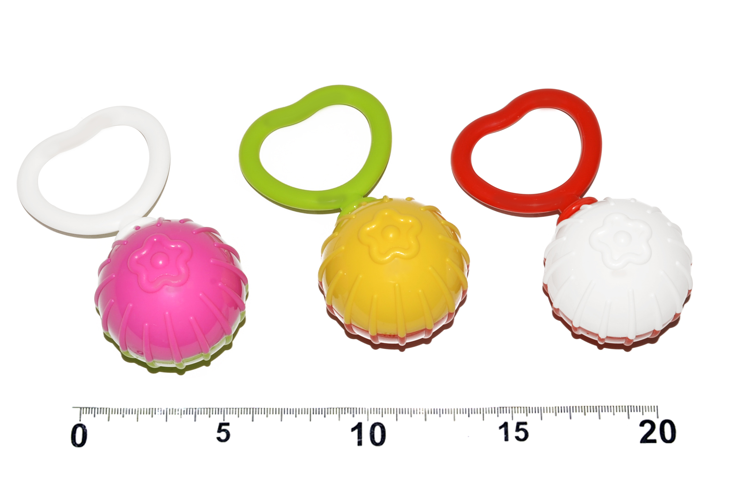 Chrastítko - koule na srdíčku. Stimuluje smysly sluchu, zraku i hmatu dítěte a zároveň se cvičí uchopovací reflex. Chrastítka splňují náročné hygienické normy, jsou bez ostrých hran a bez uvolnitelných malých částí. Různé barevné varianty - červená, mentolová, modrá, růžová, zelená, šedá, bílá.