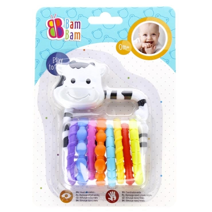 Chrastítko je určeno pro miminka. V intenzivních barvách, s rozmanitou texturou materiálů a rozmanitými formami má interaktivní prvky, které povzbuzují batole ke hře a zároveň stimulují rozvoj jeho zraku, sluchu a motoriky. Četné rukojeti zaručují bezproblémové držení chrastítka v malých ručičkách. Hračka je určena pro děti ve věku 0m+.