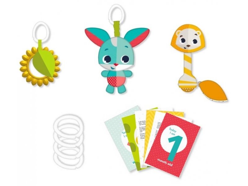 Sada hraček ve výrazných kontrastních barvách z kolekce Tiny Love Meadow Days byla pečlivě sestavena pro podporu vývoje dítěte od narození. V sadě najdete obsahuje tři závěsné hračky (slunečnici, vibrujícího králíčka a chrastítko v podobě lva), 4 závěsné propojitelné kroužky a 12 očíslovaných karet pro zaznamenání růstu dítěte během prvního roku.