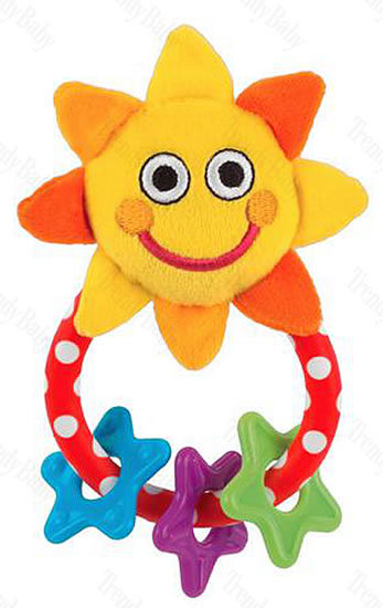 Chrastítko Sluníčko od Sassy je lehké, snadno uchopitelné chrastítko. Z jedné strany usměvavé, z druhé strany spící sluníčko, vyrobené z jemné textilie, uvnitř šustí. Hvězdičky na držadle se pohybují a jemně chrastí. Různorodé textury podněcují dítě ke zkoumání. Vhodné od narození.