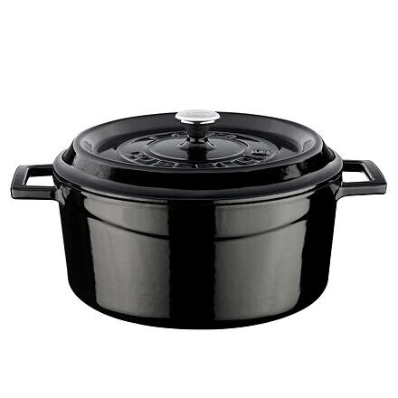 Hrnec litinový kulatý, černý, obsah 4,5 l, Ø 24 cm LAVA MetalTento vysoce kvalitní litinový hrnec je skvělým doplňkem do vaší kuchyně. Je vyroben z třívrstvé smaltované litiny, která byla dvakrát vypalována, což zajišťuje vysokou odolnost a trvanlivost. S průměrem 24 cm a objemem 4,5 litru je...