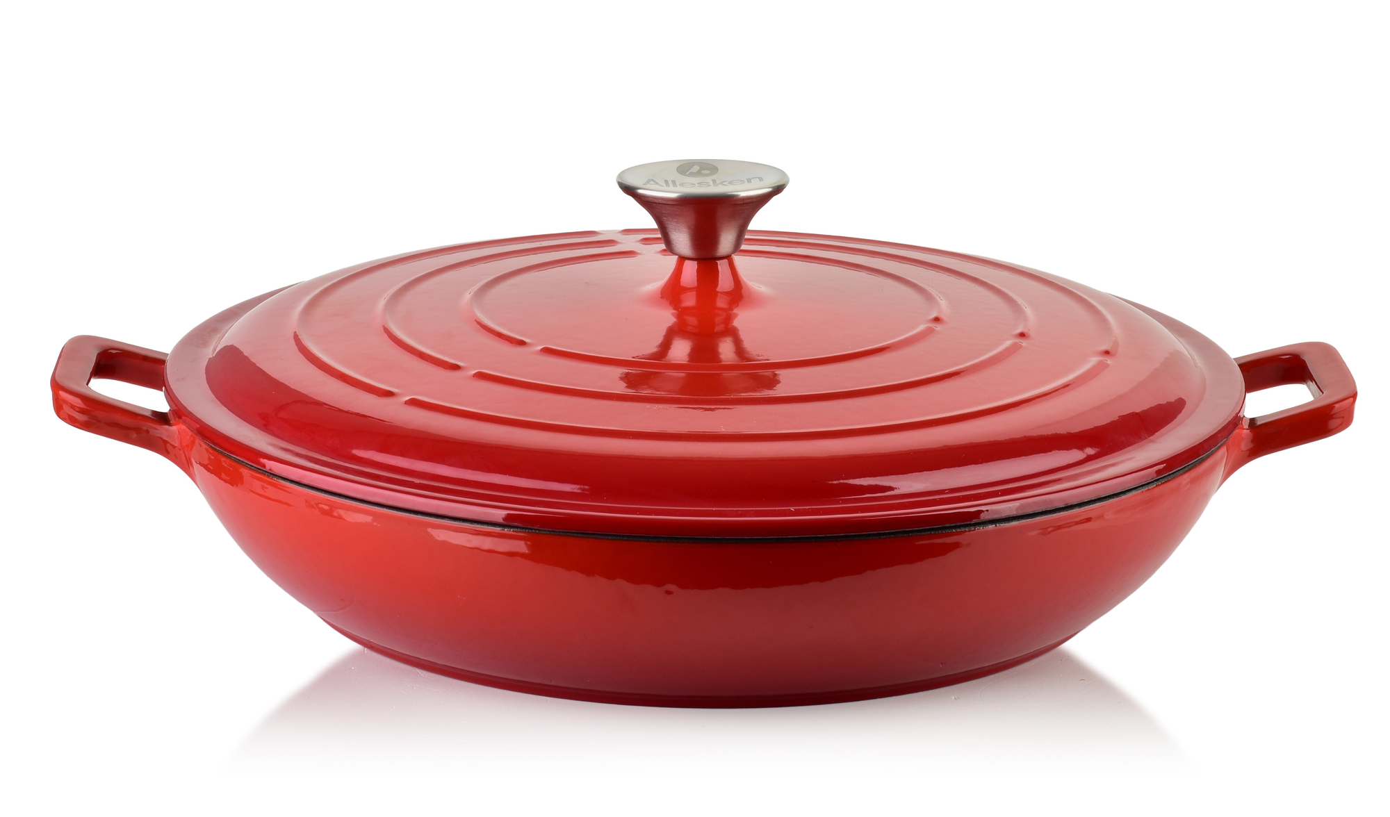 RODELUXE Brytfanna niska żeliwna emaliowana 31x31x6cm o pojemności 2,8L.Brytfanna żeliwna w kolorze czerwonym z serii RODELUXE to wysokiej jakości naczynie kuchenne, które jest idealne do przygotowywania różnorodnych potraw, w szczególności duszonych mięs, zapiekanek oraz pieczeni. Oto kilka...