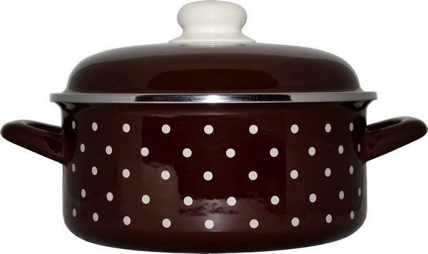 Hnědý hrnec s bílými puntíky o objemu 2 l, s poklicí. Je vhodný do myčky nádobí. Lze jej použít na všechny typy varných desek včetně indukce. Materiál - smalt. Rozměry - průměr 18 cm, výška 9 cm. prečítať celé