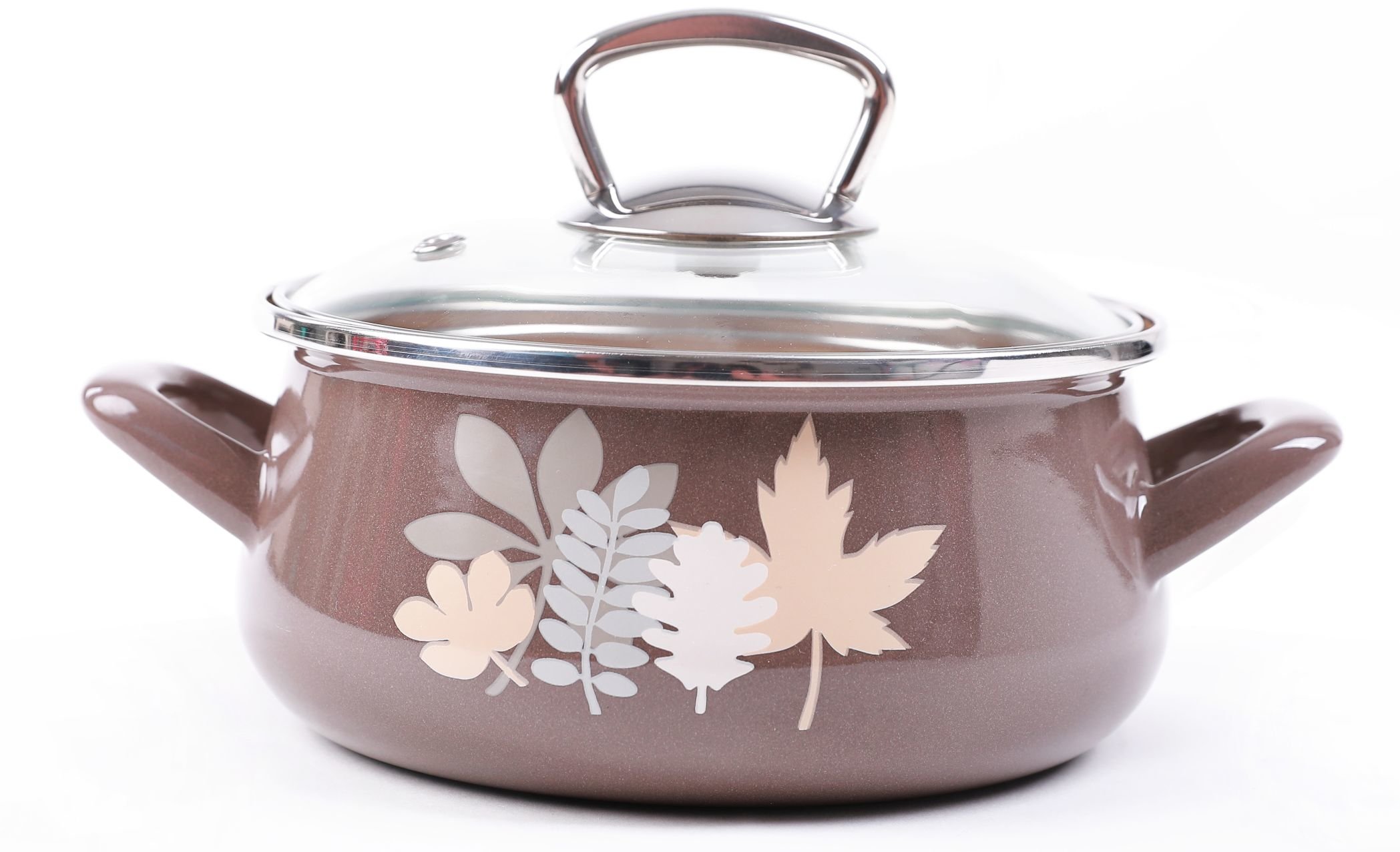 Smaltovaný hrnec s motivem lístků a se skleněnou pokličkou. Hrnec je vhodný do myčky nádobí. Objem 3,35 l. Materiál - smalt, sklo, kov. Rozměry - výška (bez pokličky) 9,5 cm, výška (s pokličkou) 16,5 cm, průměr 21,5 cm. prečítať celé