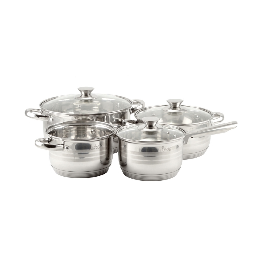 Sada nerezového nádobí se skleněnou poklicí a rendlíkem. Nerezové rukojeti a úchyty, leštěný povrch se satynovým dekorováním. Rovnoměrná a rychlá tepelná vodivost zajistí úsporné vaření. Odolný materiál nádobí je nenáročný na čištění, vhodný i do myček nádobí. Ergonomické nerezové rukojeti....
