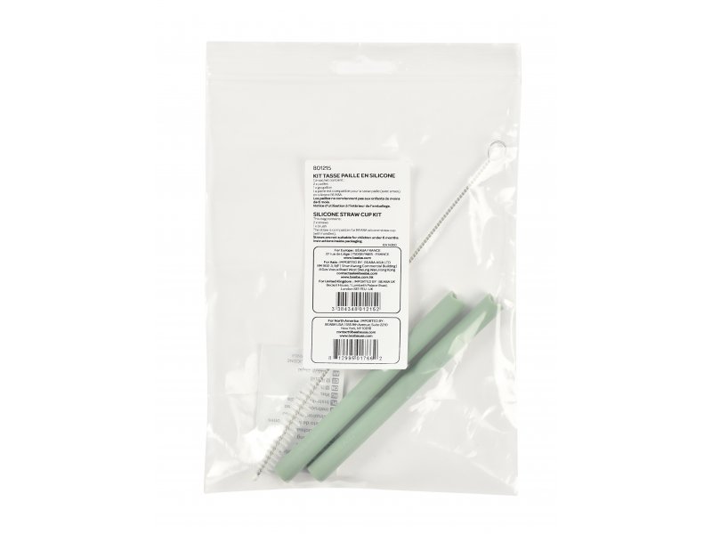 Dvě náhradní brčka k silikonovém hrnku s brčkem Beaba. Součástí balení je i dlouhý úzký kartáček pro čištění silikonového brčka.