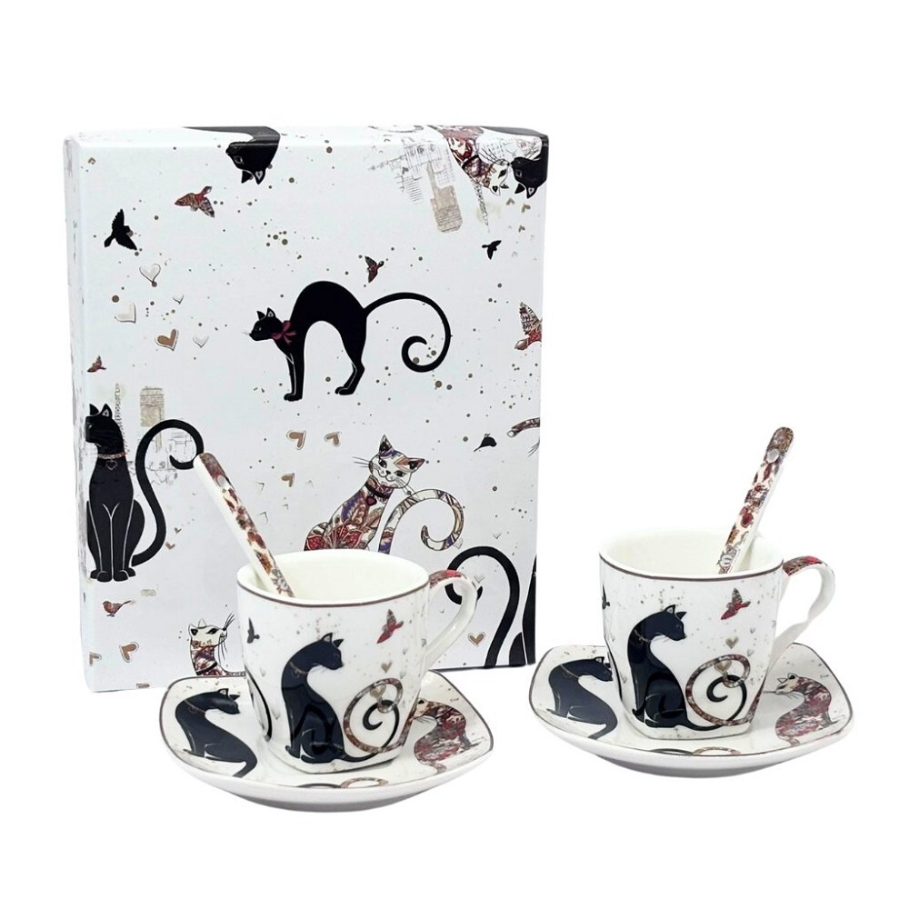 HOME ELEMENTS Šapo sada espresso 90 ml, dva šálky se lžičkami, Kočky