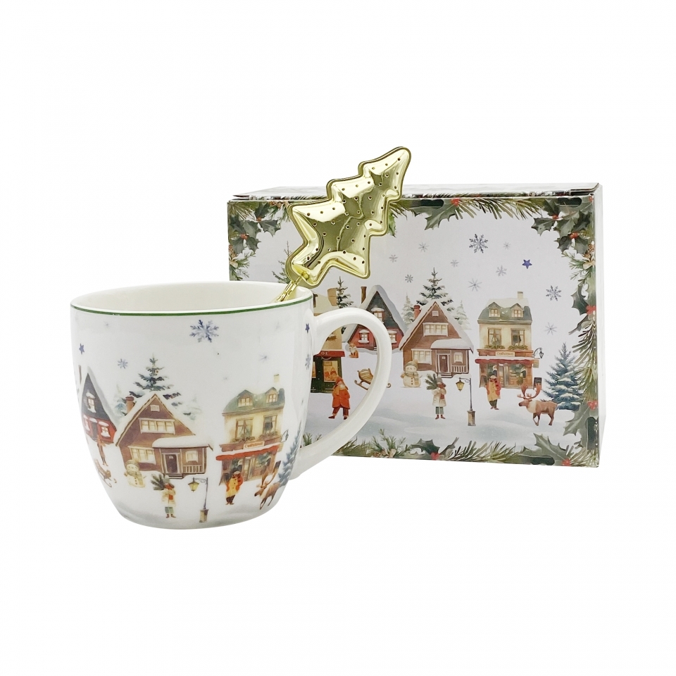 Porcelánový hrnek VÁNOČNÍ VESNICE, 460 ml v krabičce s kovovým sítkem na čaj