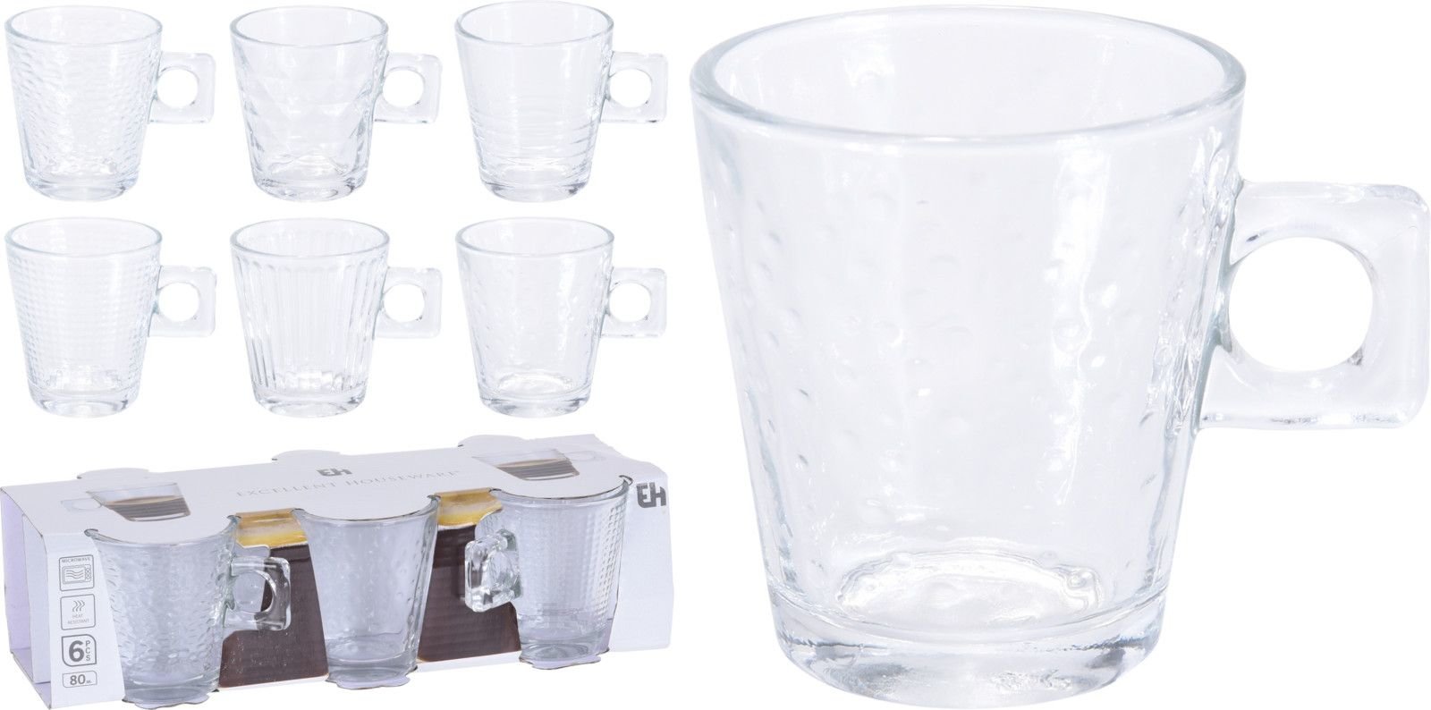 Skleněné hrnečky s uchem na espresso o objemu 80 ml. Sada 6 hrnečků s různým motivem zdobení skla. Jsou vhodné do mikrovlnné trouby. Materiál - sklo. Rozměry - výška 6,5 cm, průměr 5,5 cm. prečítať celé