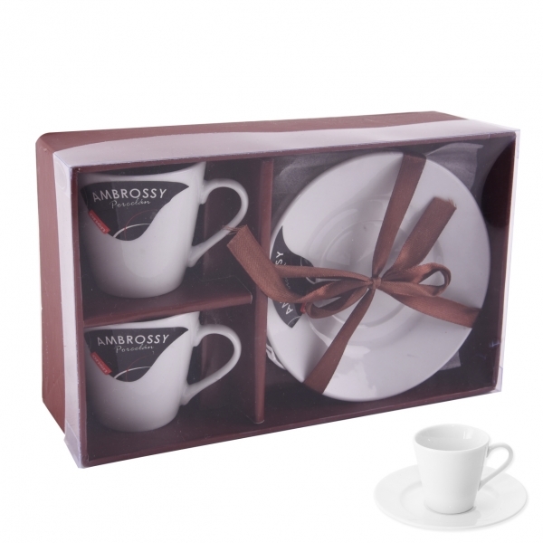 Hrnek s uchem a podšálek. Materiál: porcelán. Barva bílá. Sada 2+2 ks. Rozměry: objem 0,09 l, pr. š. 6 cm, pr. podš. 12 cm. prečítať celé