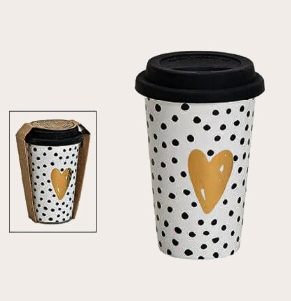 Stylový puntíkovaný hrnek (mug to go) se srdíčkem a silikonovým víčkem vhodný na horké i studené nápoje. Materiál: porcelánRozměry:výška 14 cmšířka 9 cmhloubka 9 cmobjem 300 ml prečítať celé