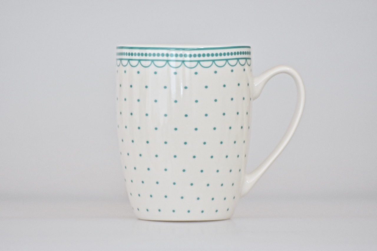 Velký hrníček s puntíky.Materiál: porcelánRozměr:výška hrnku 8 cmprůměr hrnku 11 cmhrnek s uchem délka 13,5 cmobjem hrníčku 350 ml prečítať celé