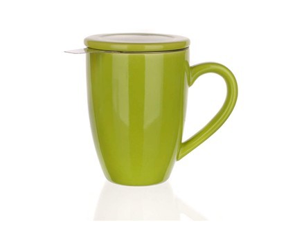 Hrnek s víčkem 350 ml BONNET, zelená glazura, materiál - keramika, nerezové sítko na louhování čaje. Rozměry hrnku: výška 12 cm, průměr 8,5 cm. Hrnek i víčko lze používat do mikrovlnné trouby a mýt v myčce na nádobí. prečítať celé