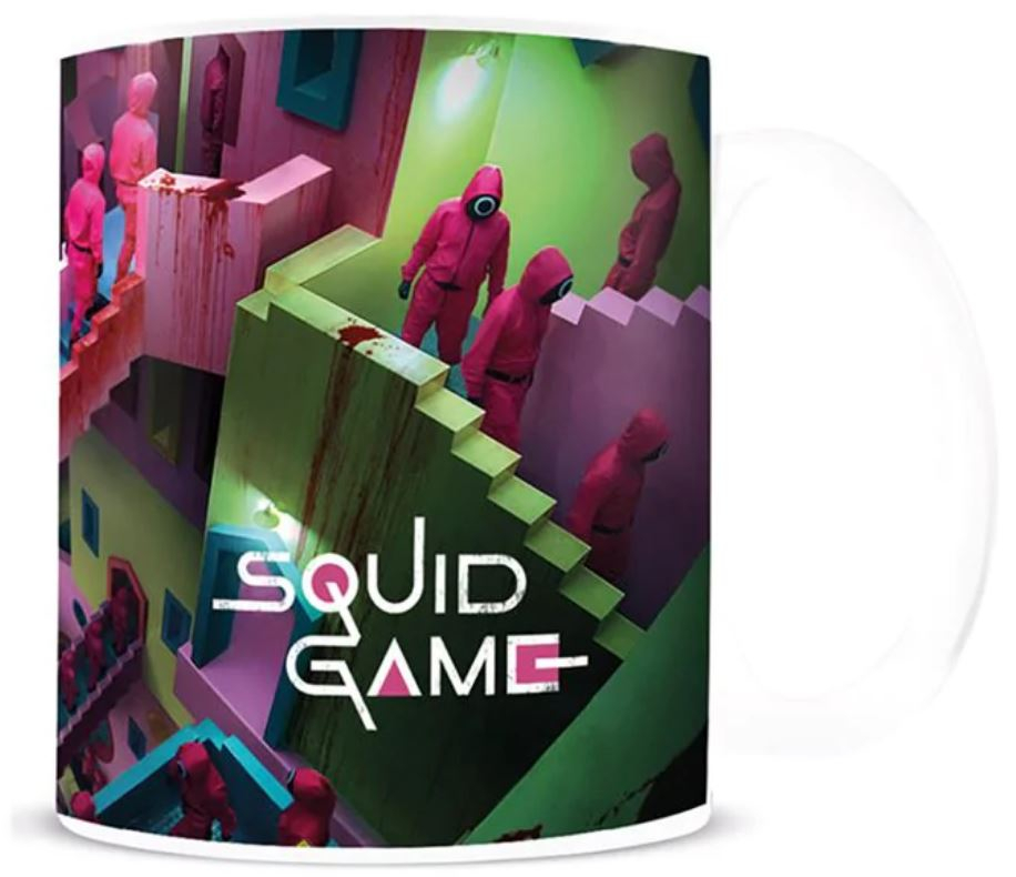 Oficiální hrnek a doplňkové zboží z katalogu produktů s logem a grafikou populárního jihokorejského dramatického televizního seriálu Squid Game (Hra na oliheň). Zboží je legálně licencováno a prodáváno se souhlasem vlastníků licenčních práv.Bílý keramický hrnek s motivem známých Stairs z...