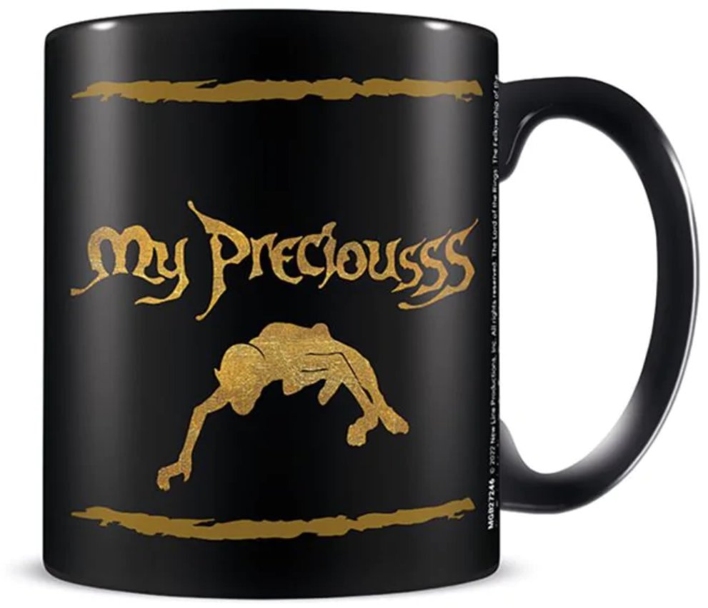 Oficiální keramický hrnek z katalogu produktů s logem, fotografiemi a grafikou populární americké filmové fantasy trilogie Lord of the Rings (Pán Prstenů).Zboží je legálně licencováno a prodáváno se souhlasem vlastníků licenčních práv.Černý keramický hrnek s grafickým potiskem My Preciousss.Objem...