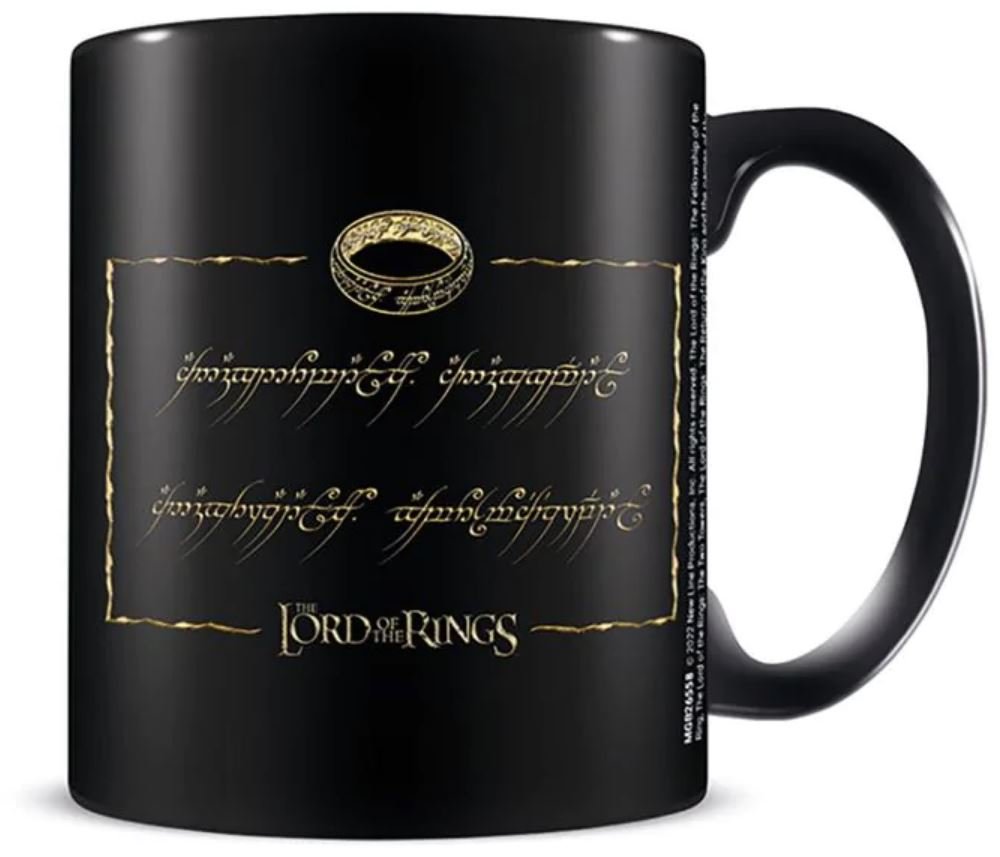 Oficiální hrnek z katalogu produktů s logem, fotografiemi a grafikou populární americké filmové fantasy trilogie Lord of the Rings (Pán Prstenů).