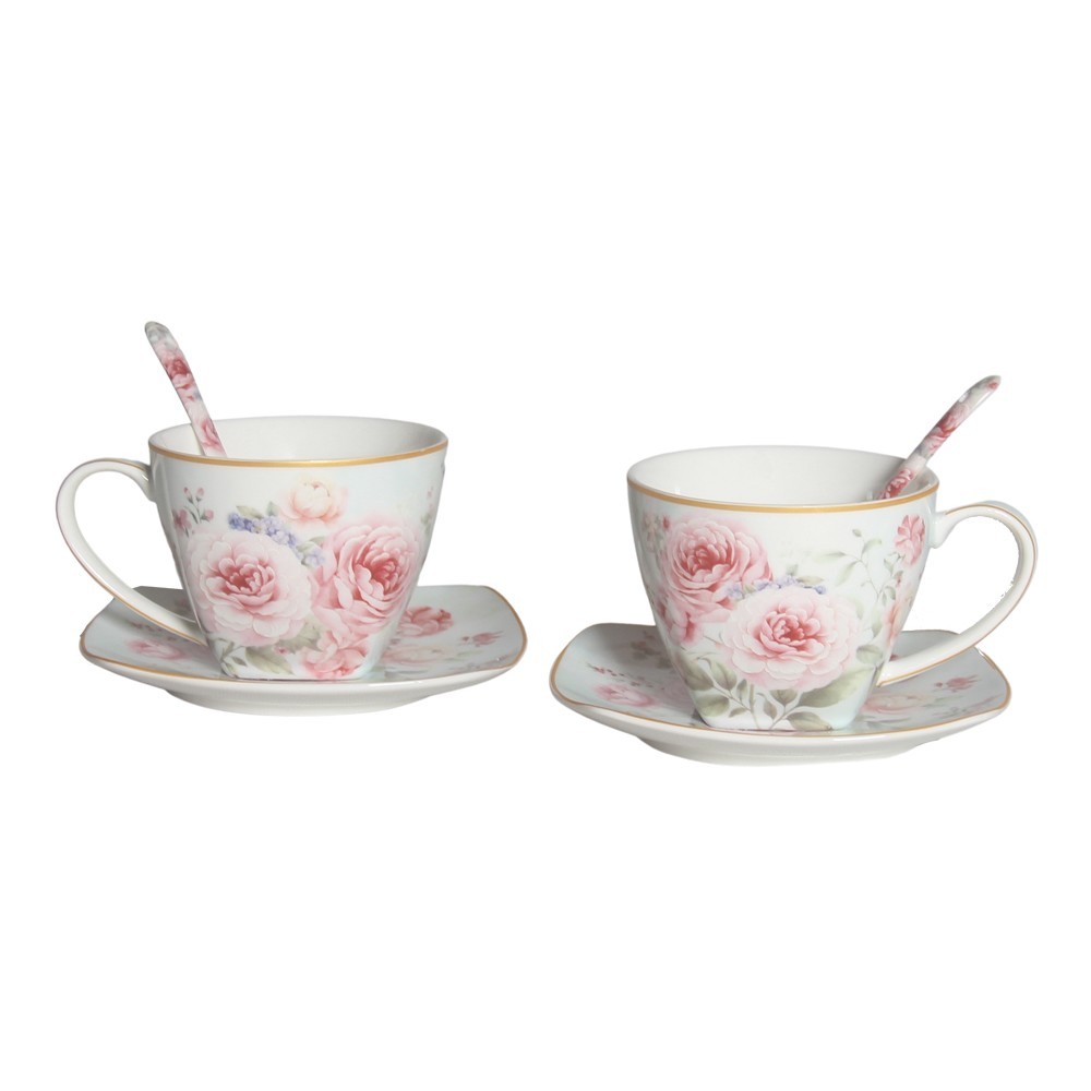HOME ELEMENTS Sada dvou šálků 250 ml, s podšálky a lžičkami, Růže