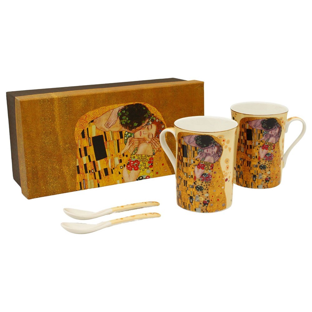 HOME ELEMENTS Sada - dva hrnky 300ml se lžičkami - Klimt Polibek zlatý