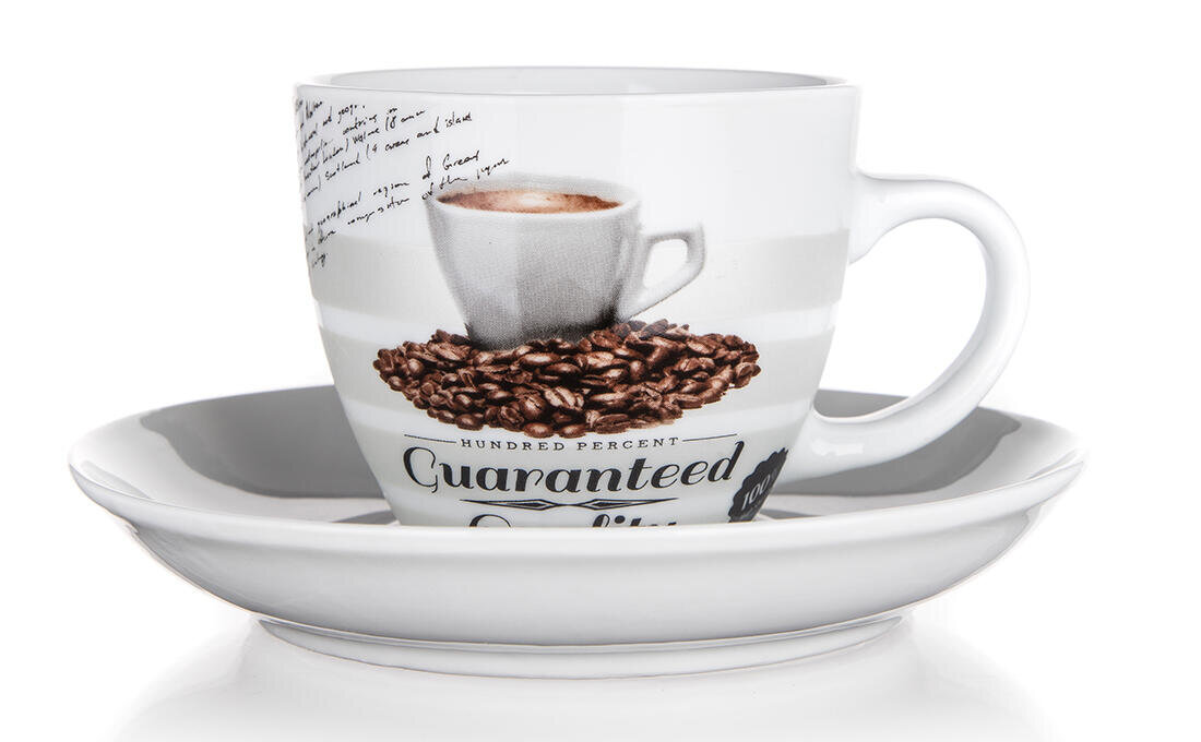 Šálek s podšálkem s dekorem GUARANTEED QUALITY, je vhodný na podávání kávy.