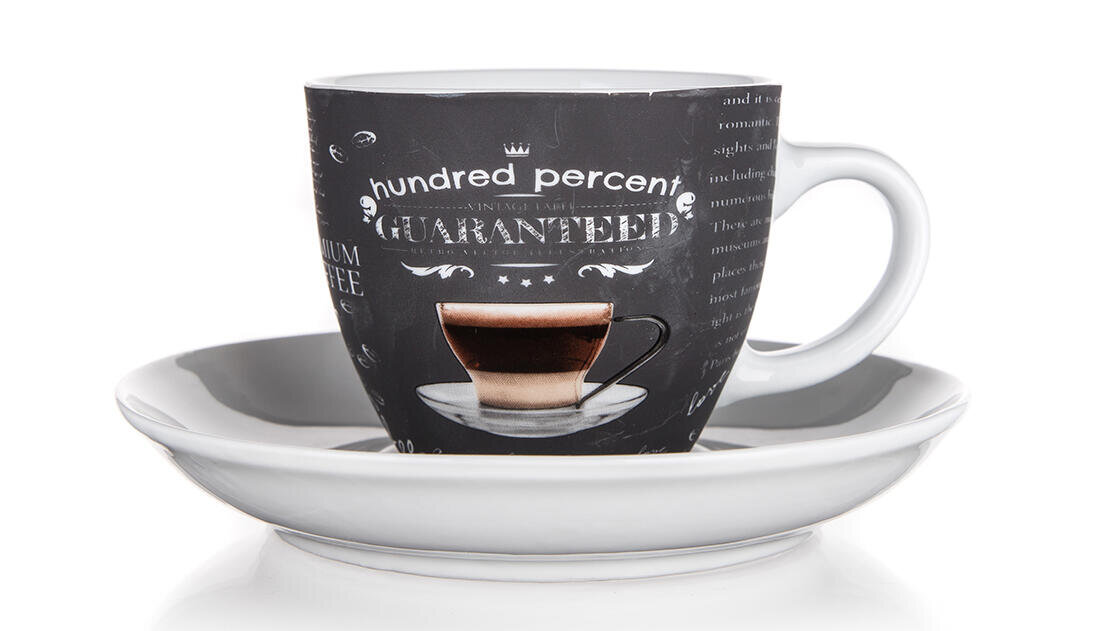 Šálek s podšálkem s dekorem 100 PERCENT, je vhodný na podávání kávy.