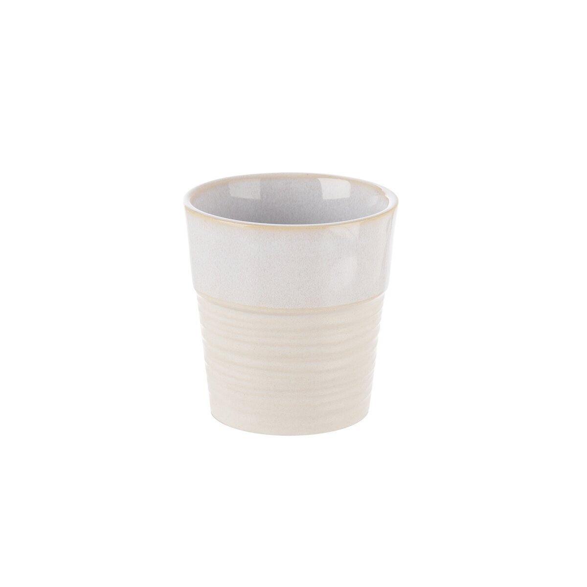 Zajímavě řešený hrneček na espresso ozvláštní servírování kávy. Je bez ouška, s jemným plastickým dekorem. Uvnitř lesklý, vně kombinace lesku a matu. Lze použít i na mini dezerty. Materiál: kamenina. Rozměry: pr. 6 cm, v. 6 cm, o. 80 ml. Lze mýt v myčce, použít v troubě i v MVT.