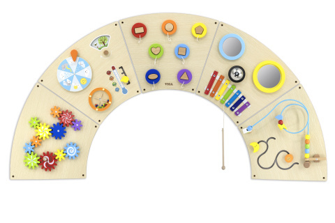 Dřevěná nástěnná hra obsahuje 12 různých aktivit (např. otáčení ozubených koleček, tabulku s počasím, kolečka s tvary, xylofon nebo gong). Rozměry hry 162x81x11 cm. Baleno v krabici. Rozměry balení 54x44x33 cm. Věk 18m+ prečítať celé