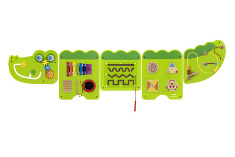 Dřevěná nástěnná hra Krokodýl - junior. Nástěnná hra obsahuje herní prvky jako např. xylofon, magnetické bludiště nebo ozubená kolečka. Rozměry hry 180x50,5x5,5 cm. Rozměry balení 45x23x36 cm. Věk 18m+ prečítať celé