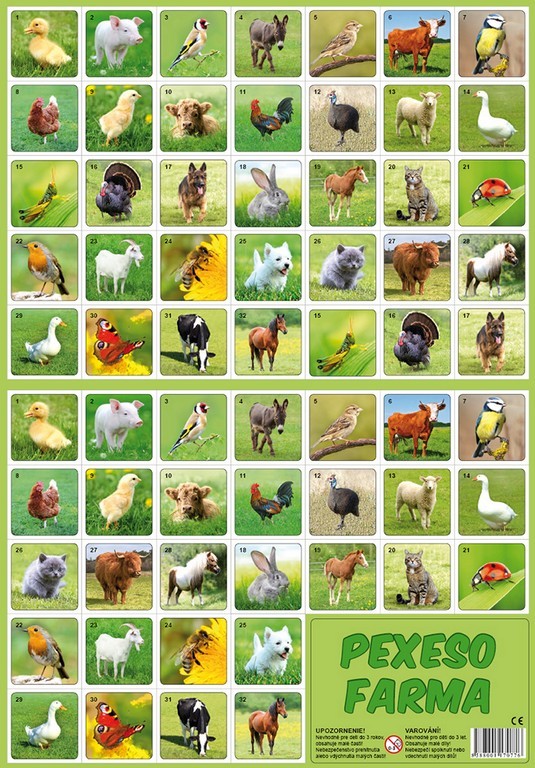 - Obsahuje 32 dvojíc kariet s obrázkami zvieratiek z farmy